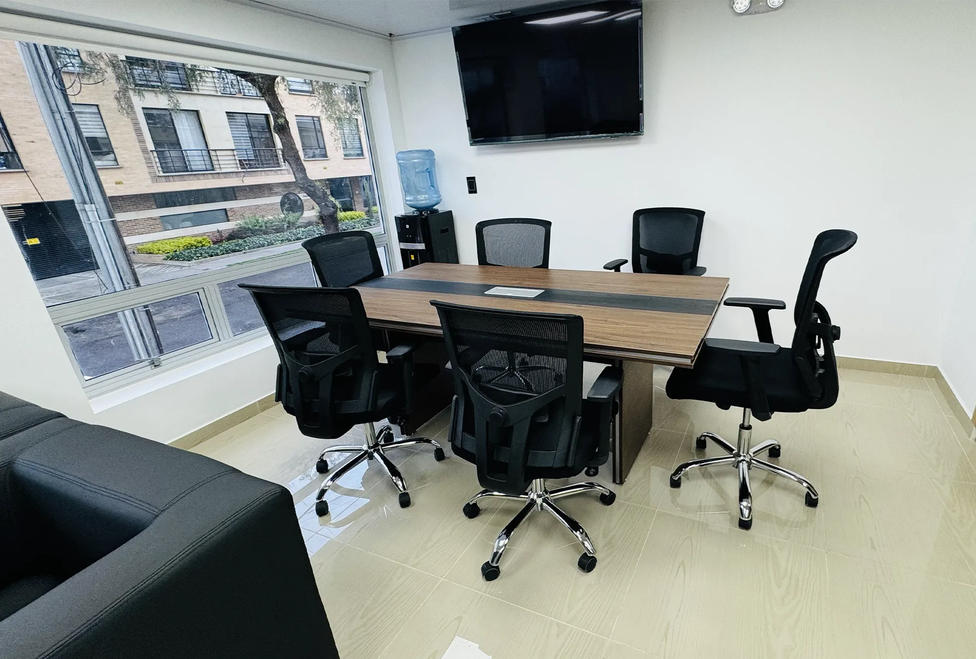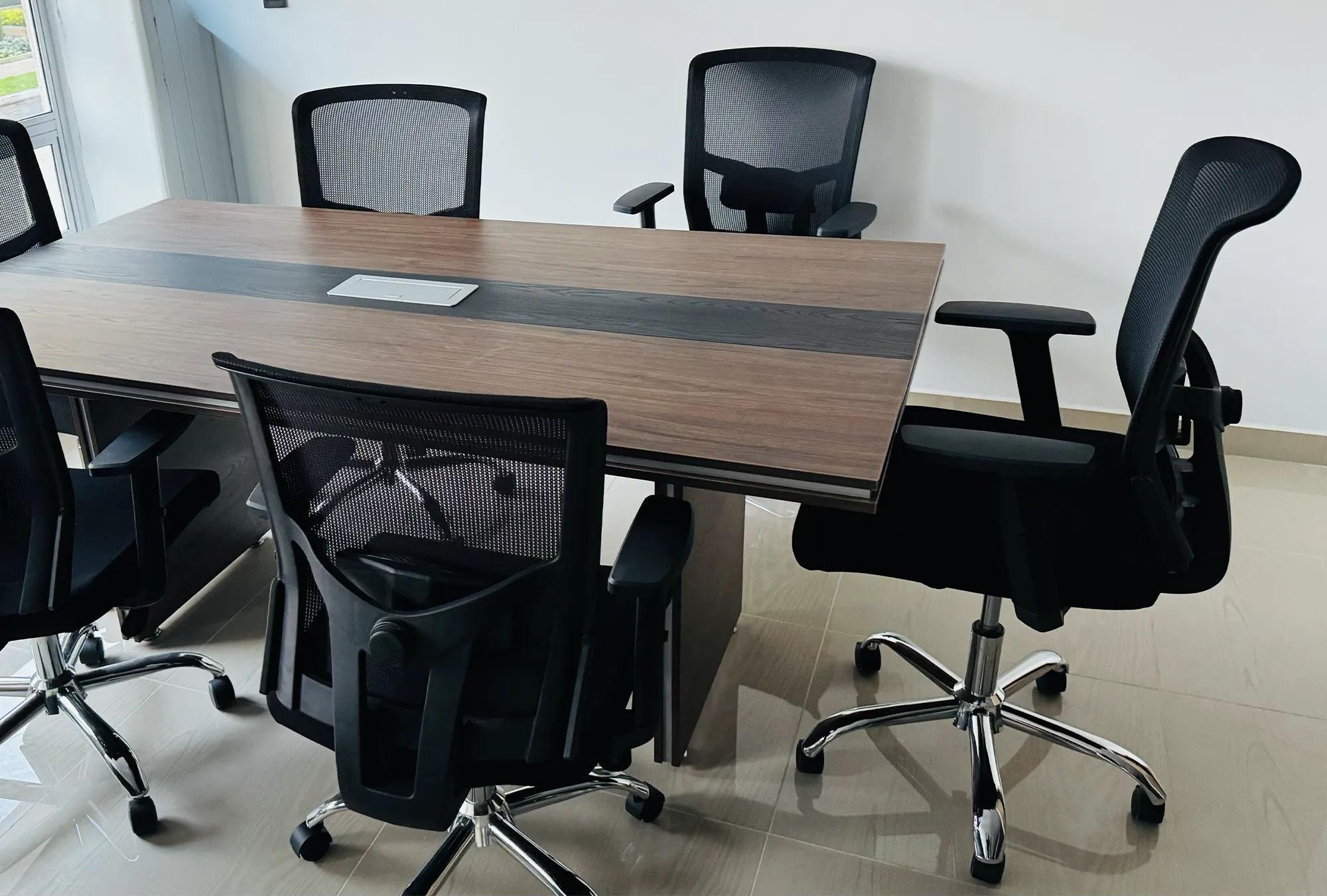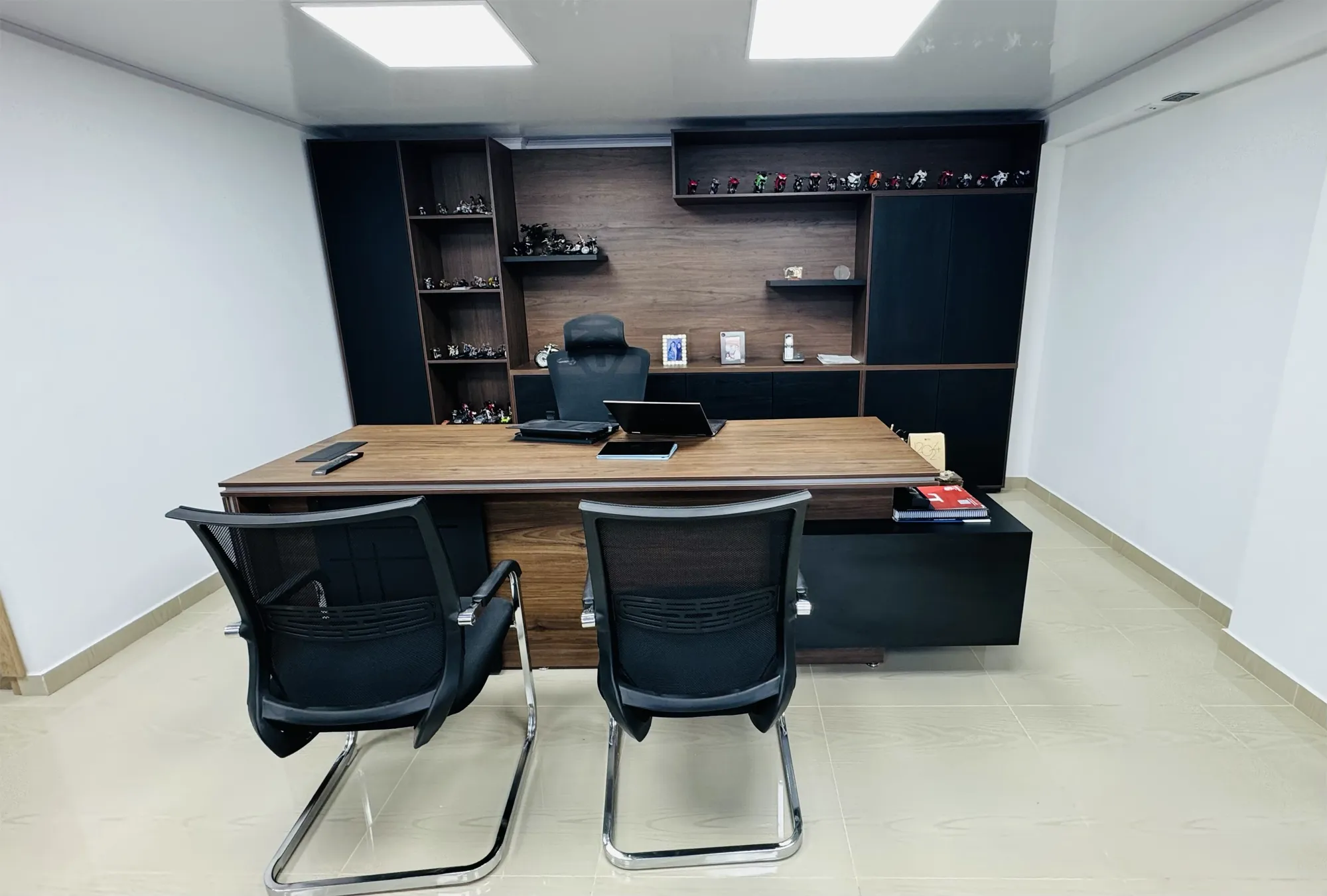 Diseñamos y fabricamos una oficina ejecutiva y una sala de reuniones a la medida. Madera en tonos cálidos con acentos negros, almacenamiento integrado y gestión de cableado oculta. Sillas ergonómicas en malla, iluminación uniforme y soporte A/V para videollamadas. Resultado: un espacio profesional, cómodo y listo para decidir.